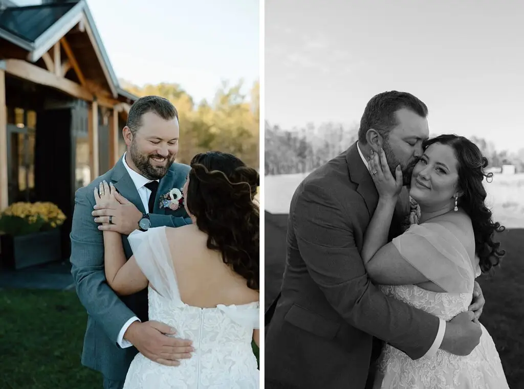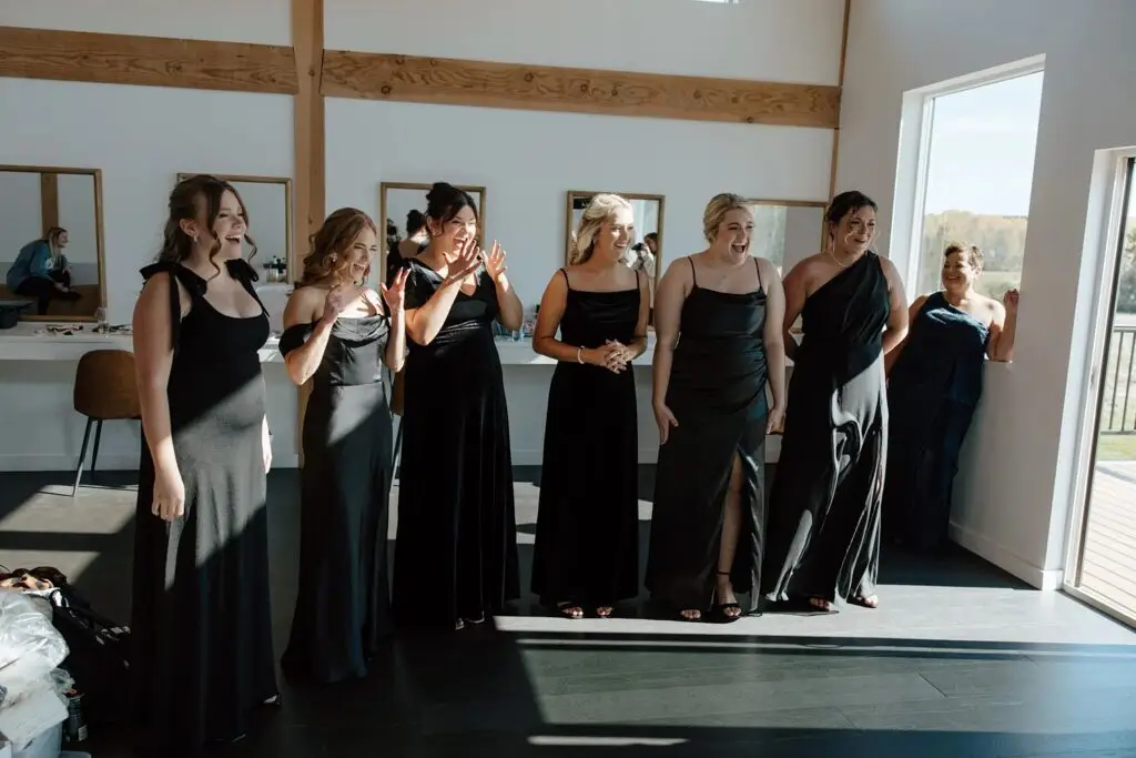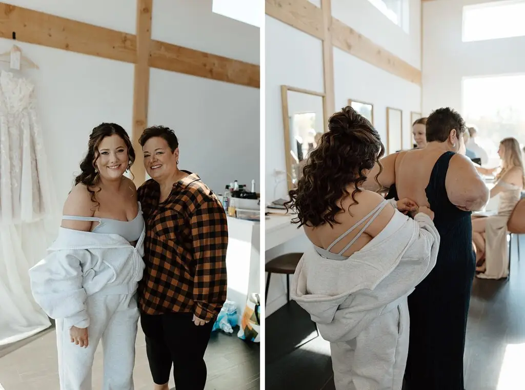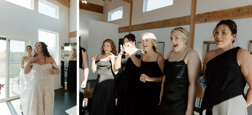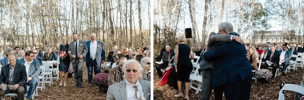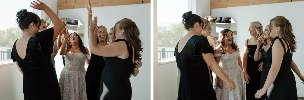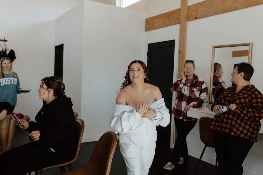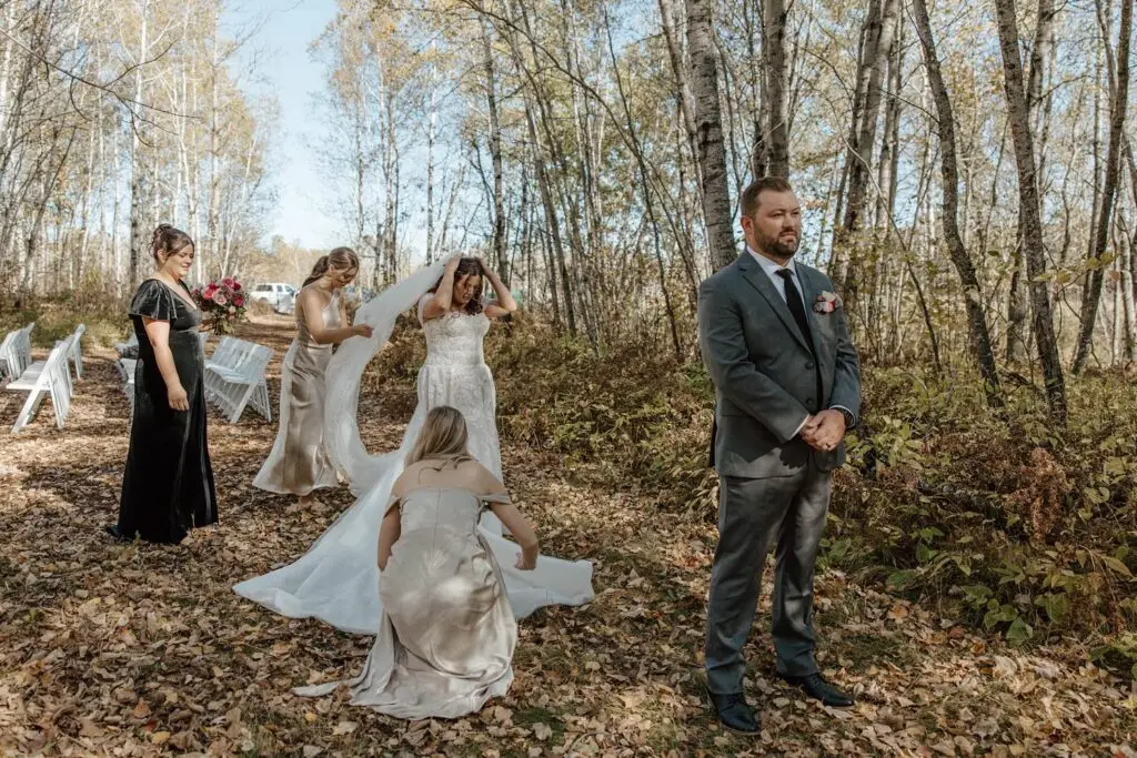 The morning started slow and cozy, as Monét got ready with her girls in the hotel. She even surprised everyone with matching sweatsuits (1000/10 idea, everyone was obsessed!), and the vibe was pure calm-before-the-party. The morning rolled into some of my favorite moments; a first look with her dad, another with her brother (I still can’t get over that photo of her mom peeking out the window), and then a private first look with Pete at their ceremony site in the woods. Just the two of them, surrounded by fall colors and that crisp autumn air. It couldn’t have been more perfect.